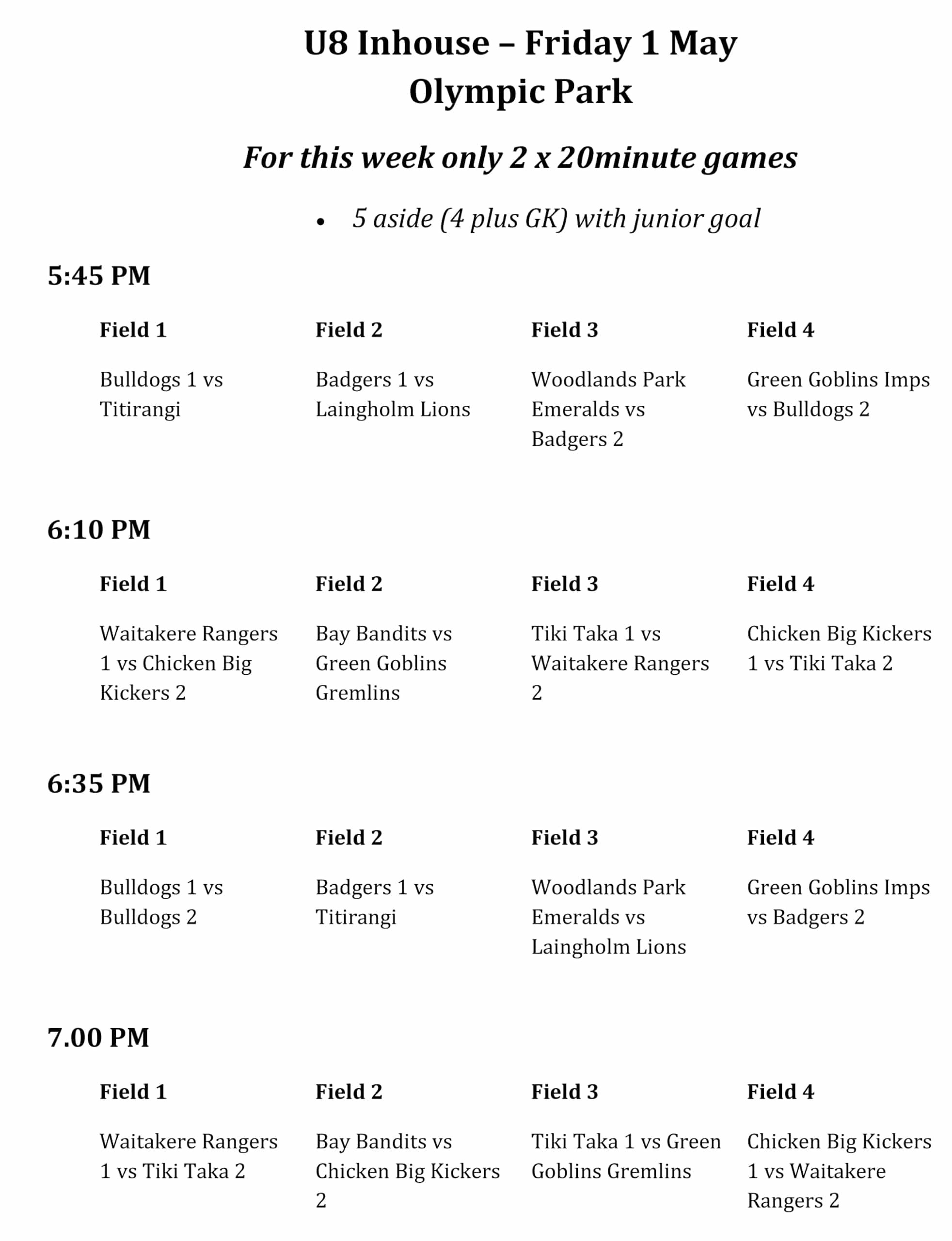 U8s will play 2 x 20-minute matches at Olympic Park due to the field layout.